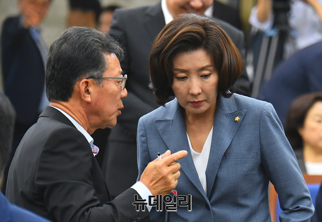 나경원 자유한국당 원내대표가 9일 오후 국회에서 열린 의원총회에 참석해 홍철호 의원과 대화를 나누고 있다.