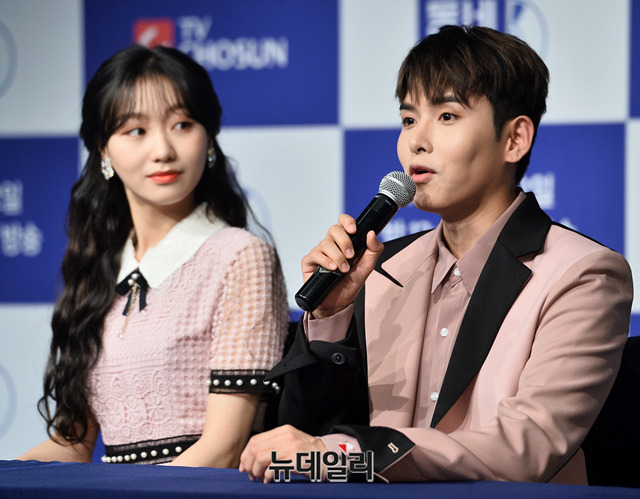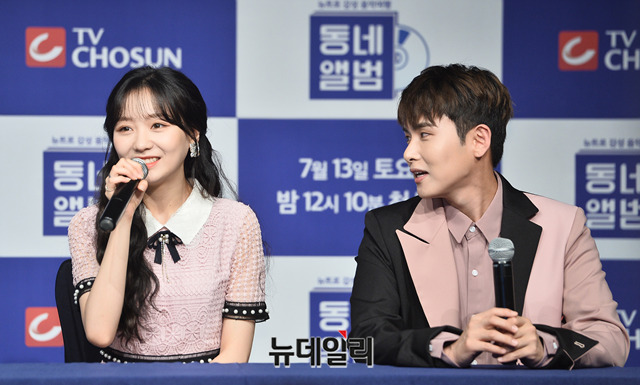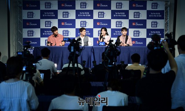 가수 KCM(왼쪽부터), 개그맨 권혁수, 러블리즈 수정, 슈퍼주니어 려욱이 9일 오후 서울 영등포구 서울마리나에서 열린 TV CHOSUN '동네앨범(기획 김동준, 프로듀서 민정식)' 제작발표회에서 프로그램 소개를 하고 있다.