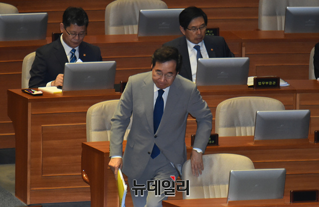 이낙연 국무총리가 9일 오후 국회 본회의장에서 열린 정치·외교·안보·통일 분야 대정부질문에서 출석해 단상으로 향하고 있다.
