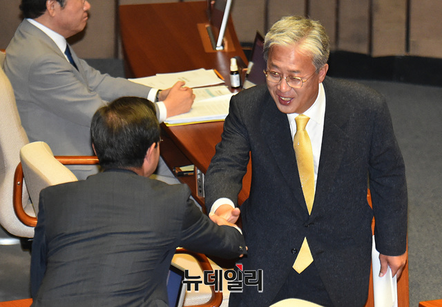 [포토] 동료 의원들과 악수 나누는 유성엽 민주평화당 원내대표