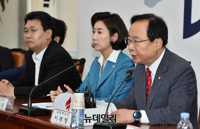 국회부의장인 이주영 자유한국당 의원이 10일 오전 국회에서 열린 원내대표·중진의원 연석회의에서 모두발언을 하고 있다.