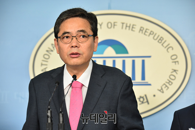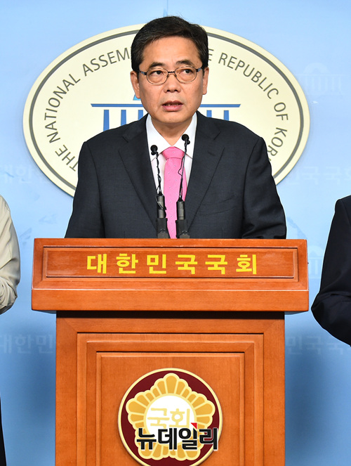 자유한국당 곽상도, 김한표, 전희경 의원이 10일 오전 국회 정론관에서 전교조 성과급 균등 분배 관련 13개 시 도교육청 교육감 고발 기자회견을 갖고 있다.