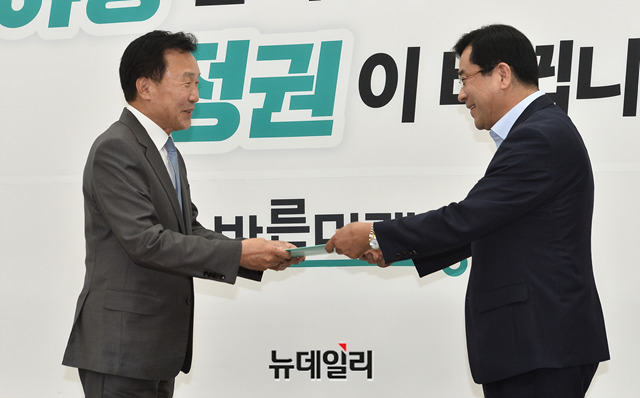 손학규 바른미래당 대표가 10일 오전 국회에서 열린 중소기업특별위원회 임명장 수여식에서 홍익표 중소기업특위 자문위원에게 임명장 전달 직후 기념촬영을 하고 있다.