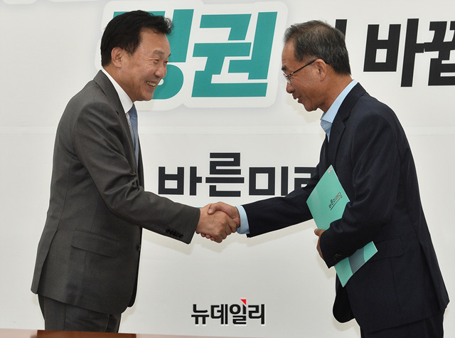 손학규 바른미래당 대표가 10일 오전 국회에서 열린 중소기업특별위원회 임명장 수여식에서 김형태 중소기업특위 자문위원에게 임명장 전달 직후 기념촬영을 하고 있다.