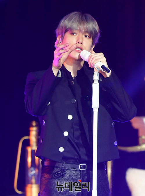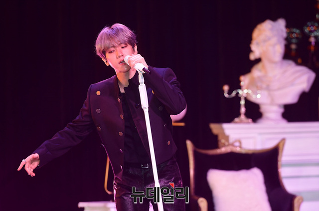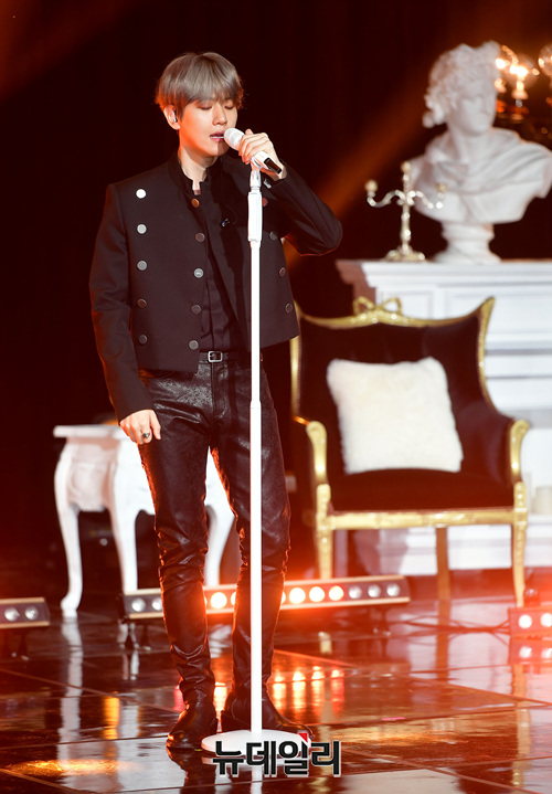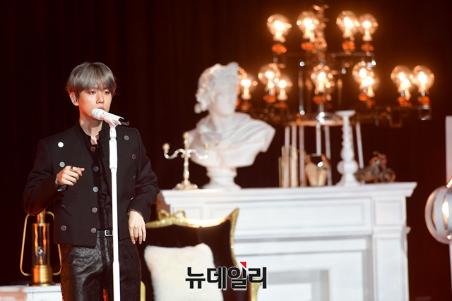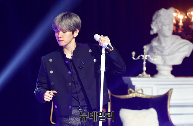 엑소 백현이 10일 오후 서울 강남구 SAC아트홀에서 열린 첫 솔로앨범 'City Light(시티 라이츠)' 쇼케이스에서 타이틀곡 무대를 선보이고 있다.