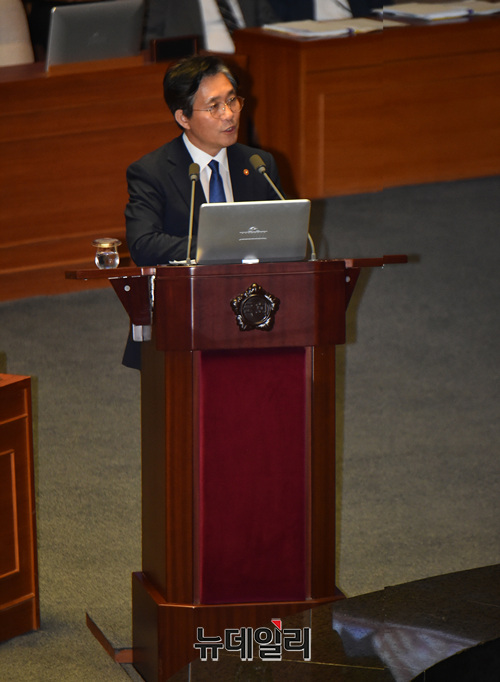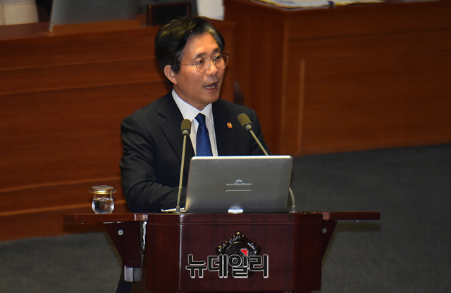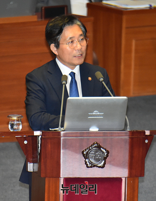 성윤모 산업통상자원부 장관이 10일 오후 국회 본회의장에서 열린 경제 분야 대정부질문에서 의원들의 질문에 답하고 있다.