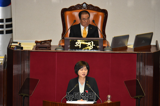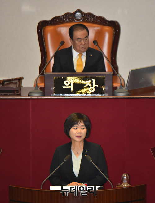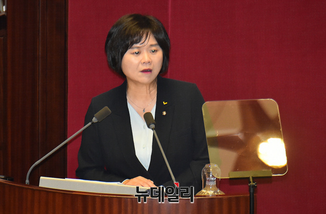이정미 정의당 대표가 10일 오후 국회에서 열린 본회의에서 비교섭단체 대표 연설을 하고 있다.