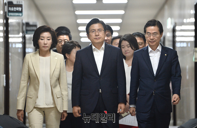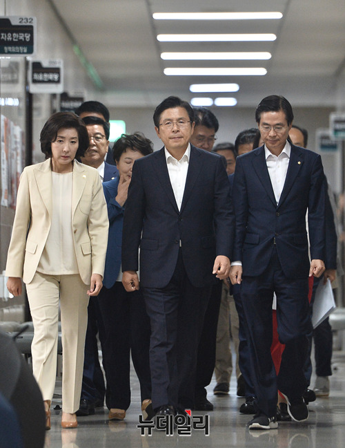 황교안 자유한국당 대표, 나경원 원내대표 및 지도부가 11일 오전 국회에서 열린 최고위원회의에 입장하고 있다.