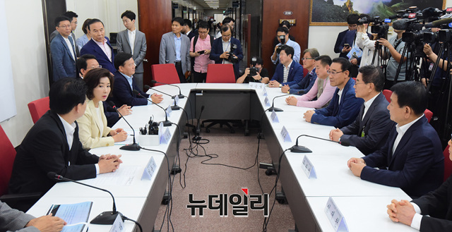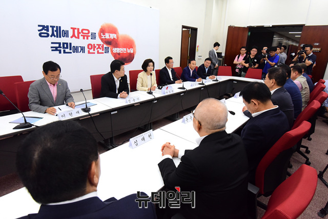 나경원 자유한국당 원내대표가 11일 오전 국회를 찾은 박복규 전국택시연합회 회장 등 택시업계 노사 대표자들과 간담회를 갖고 있다.