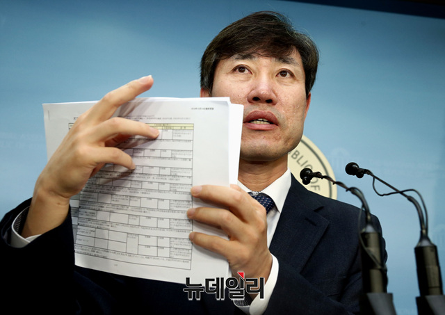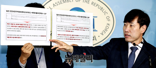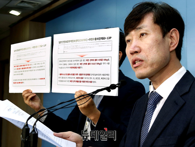 하태경 바른미래당 최고위원이 11일 오전 국회 정론관에서 일본 안전보장무역정보센터(CISTEC)가 자국 기업의 전략물자 북한 불법수출을 적발해 작성한 자료를 공개하고 있다.