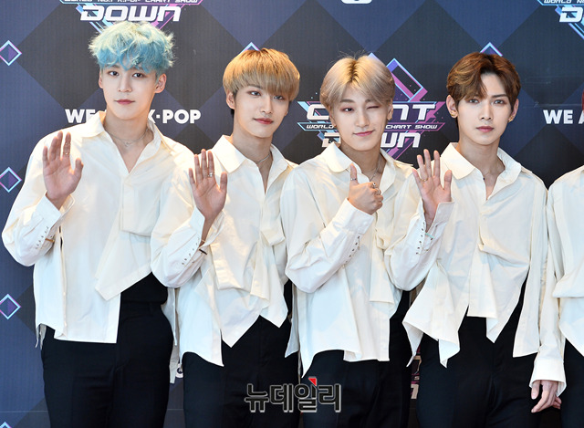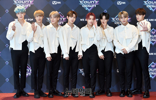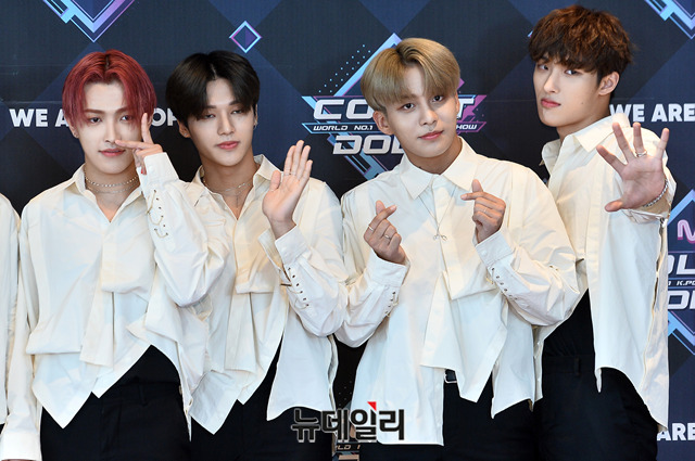 아이돌그룹 '에이티즈(ATEEZ)'가 11일 오후 서울 마포구 CJ E&M센터에서 열리는 엠카운트다운 생방송에 입장하며 포토타임을 갖고 있다.