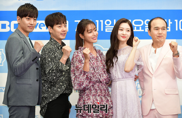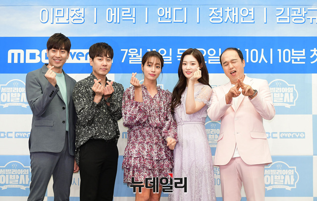 에릭(왼쪽부터), 앤디, 이민정, 정채연, 김광규가 11일 오후 서울 마포구 스탠포드호텔에서 열린 MBC에브리원 예능 '세빌리아의 이발사(연출 김동호)' 제작보고회에서 포토타임을 갖고 있다.