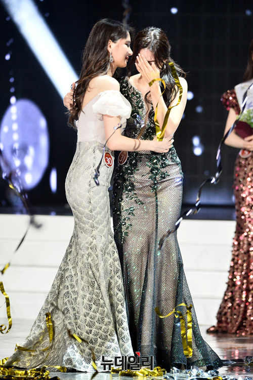 2019 미스코리아 진 김세연(오른쪽)과 미스코리아 선 이하늬가 11일 오후 서울 동대문구 경희대학교 평화의전당에서 열린 선발대회에서 발표 직후 포옹하고 있다.
