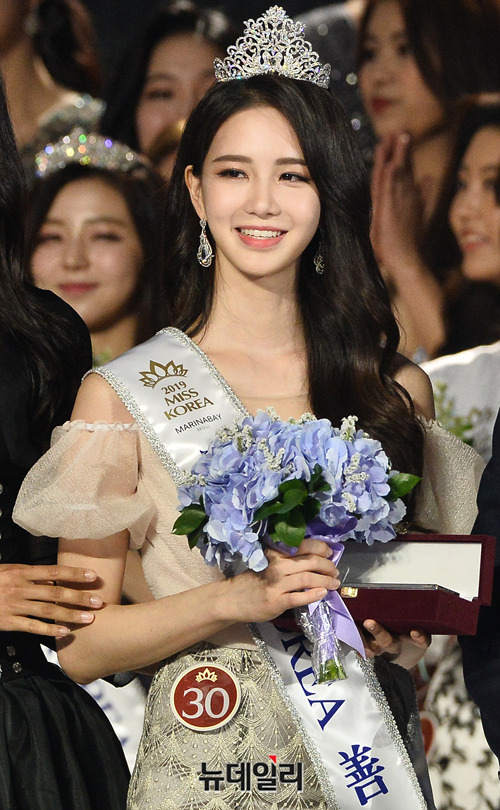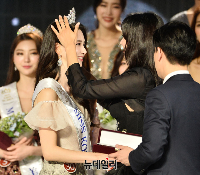 미스 대구 이하늬가 11일 오후 서울 동대문구 경희대학교 평화의전당에서 열린 '2019 미스코리아 선발대회'에서 미스코리아 선의 왕관을 받고있다.