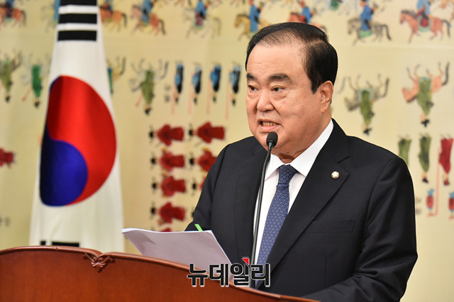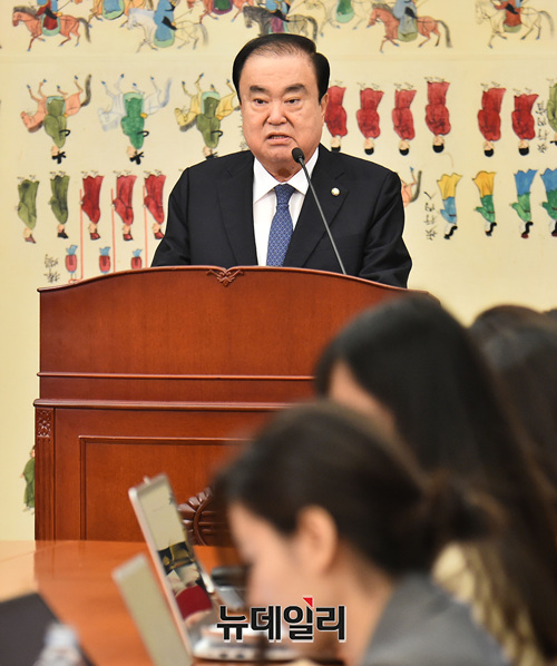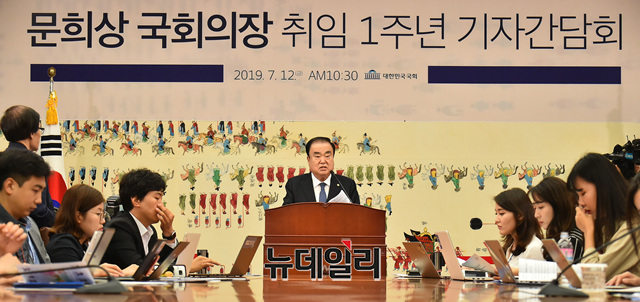 문희상 국회의장이 12일 오전 국회에서 열린 취임 1주년 기자간담회에서 모두발언을 하고 있다.