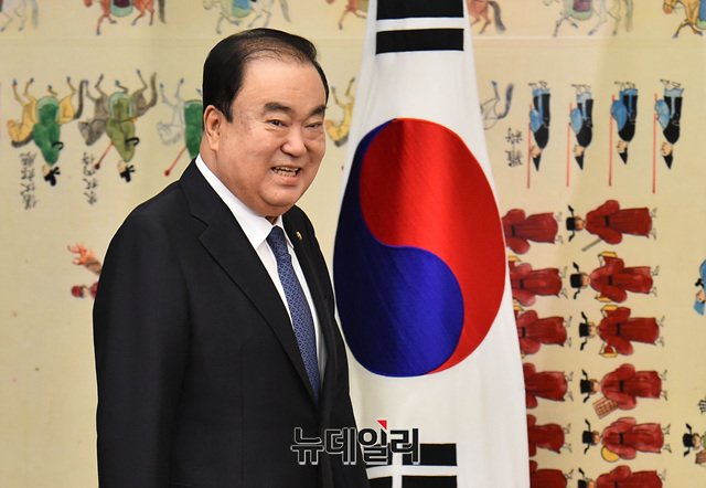 문희상 국회의장이 12일 오전 국회에서 열린 취임 1주년 기자간담회를 위해 입장하고 있다.