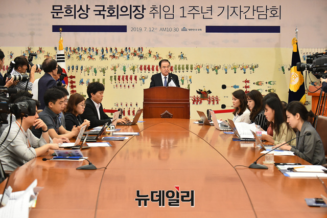 문희상 국회의장이 12일 오전 국회에서 열린 취임 1주년 기자간담회에서 모두발언을 하고 있다.
