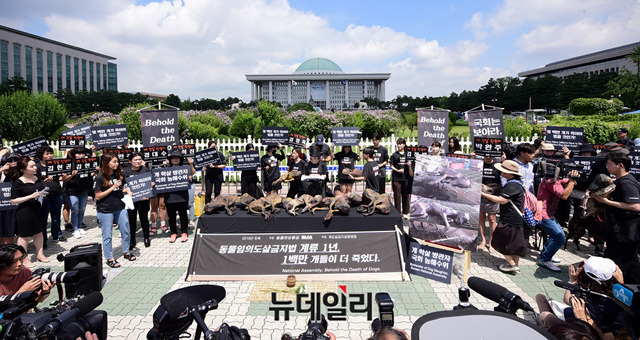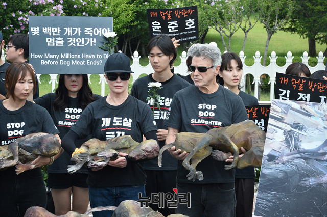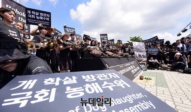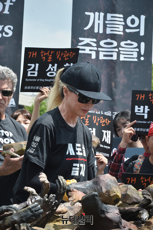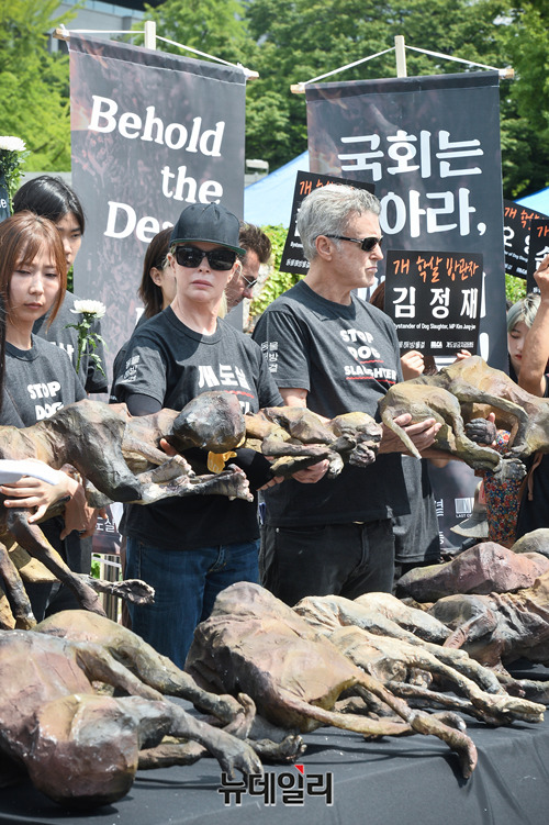 동물해방물결과 동물을위한마지막희망(LCA)이 초복인 12일 오전 국회 앞에서 열린 '2019 복날추모행동'에서 퍼포먼스를 하고 있다. 이날 행사에는 할리우드 배우 겸 동물권 운동가 '킴 베이싱어(Kim Basinger)' 등 이 참여했다.