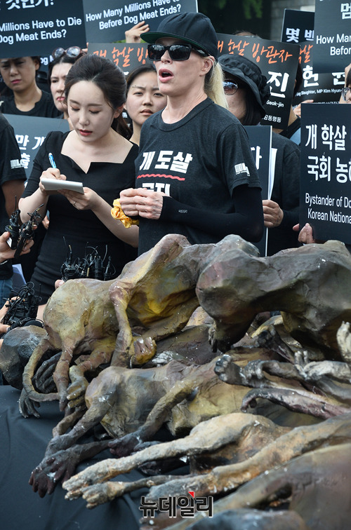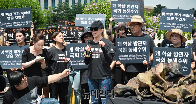 할리우드 배우 겸 동물권 운동가 킴 베이싱어(Kim Basinger)가 초복인 12일 오전 국회 앞에서 열린 '2019 복날추모행동'에서 개 식용 금지를 촉구하는 발언을 하고 있다.
