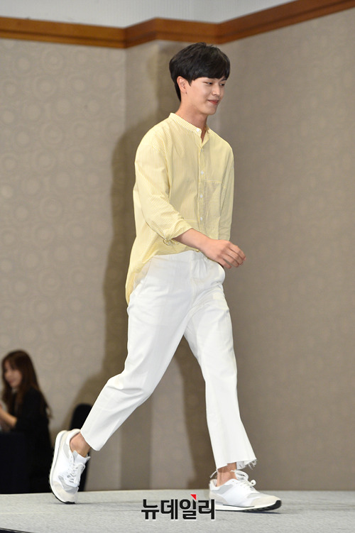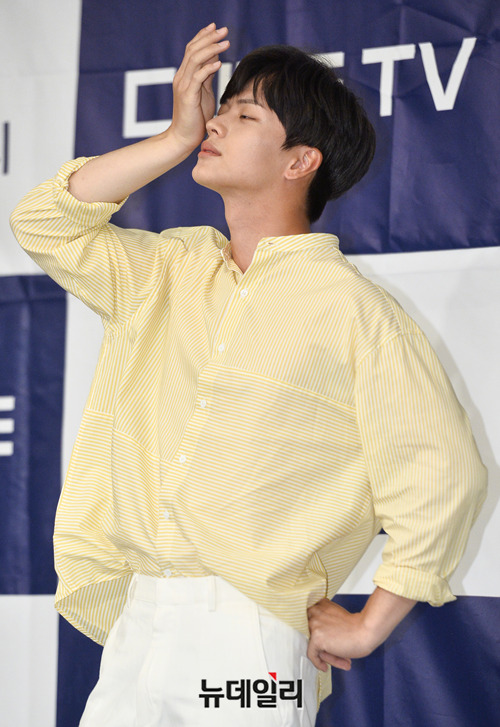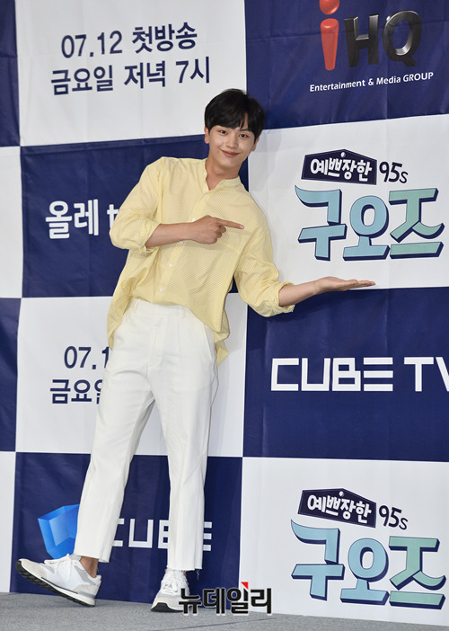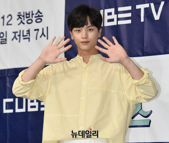 아이돌그룹 비투비 육성재가 12일 오후 서울 마포구 서울가든호텔에서 열린 큐브TV 예능프로그램 '예쁘장한 구오즈' 제작발표회에서 포토타임을 갖고 있다.