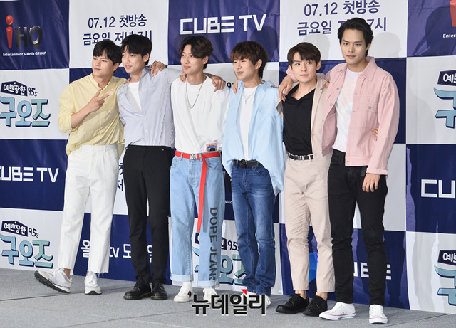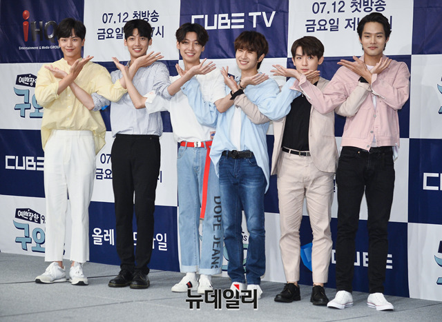 비투비 육성재(왼쪽부터), 보이프렌드 출신 조영민, 조광민, 노민우, 틴탑 리키, 모델 백경도가 12일 오후 서울 마포구 베스트 웨스턴 프리미어 서울가든호텔에서 열린 큐브TV 예능프로그램 '예쁘장한 구오즈' 제작발표회에서 포토타임을 갖고 있다.