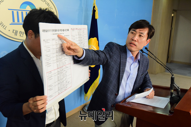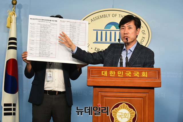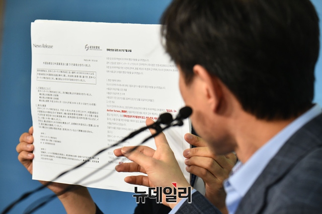 하태경 바른미래당 최고위원이 12일 오후 국회 정론관에서 일본 경시청의 대량살상무기 관련 물자 등 부정수출 사건 목록을 공개하고 있다.
