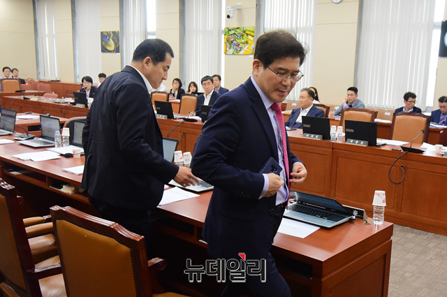 자유한국당 김성태·박대출 의원이 12일 오후 국회에서 열린 과학기술정보방송통신위원회 전체회의를 보이콧 하며 떠나고 있다.