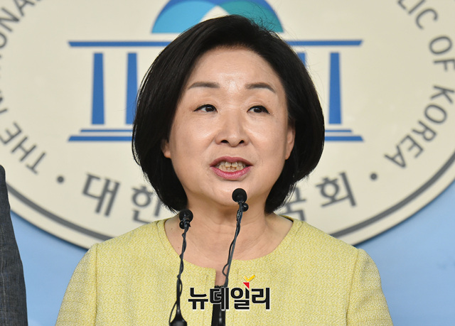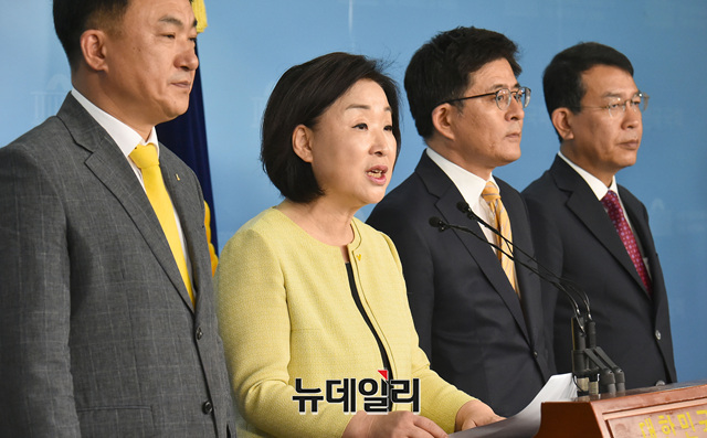 심상정 정의당 신임 당대표가 15일 국회 정론관에서 기자회견을 갖고 권태홍 사무총장, 박원석 정책위의장, 김종대 수석대변인, 신언직 비서실장 등 인사발표 발표를 하고 있다.