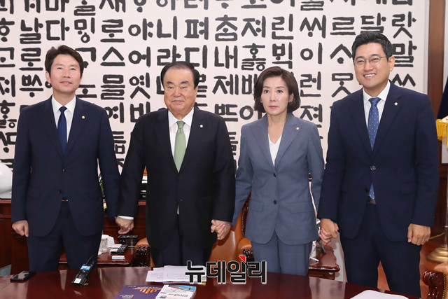 문희상 국회의장과 여야 3당 교섭단체 원내대표가 15일 오전 국회 의장실에서 회동을 갖고 있다.(왼쪽부터 이인영 더불어민주당, 문 의장, 나경원 자유한국당, 오신환 바른미래당 원내대표)