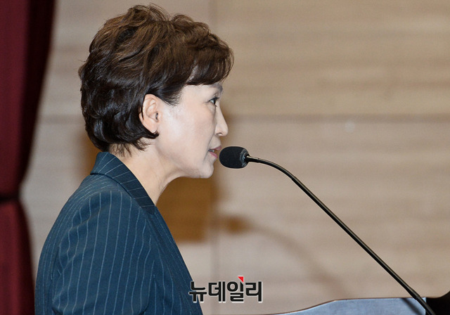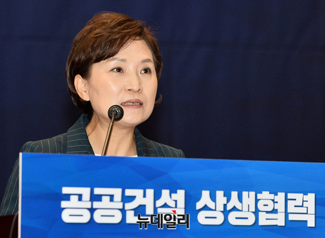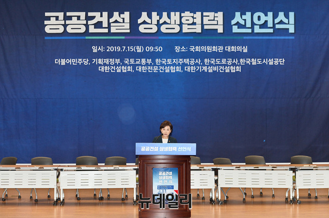 김현미 국토교통부 장관이 15일 오전 국회 의원회관에서 열린 공공건설 상생협력 선언식에서 인사말을 하고 있다.