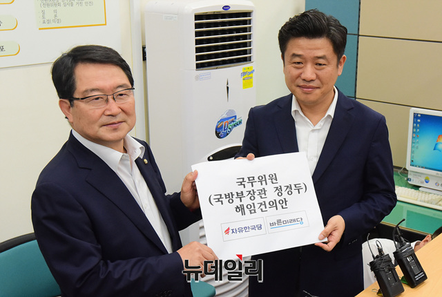 백승주 자유한국당 의원과 유의동 바른미래당 의원이 15일 오후 국회 의안과에 정경두 국방부 장관 해임건의안을 제출하고 있다.