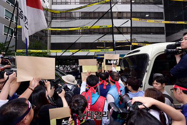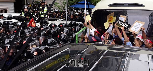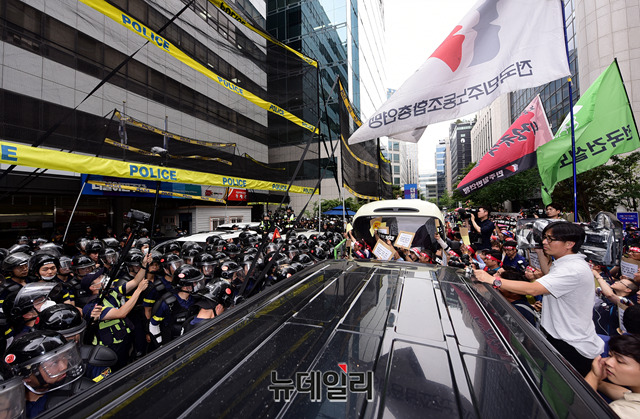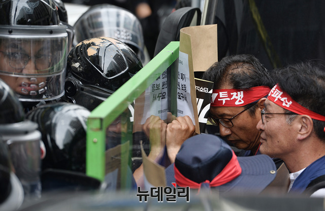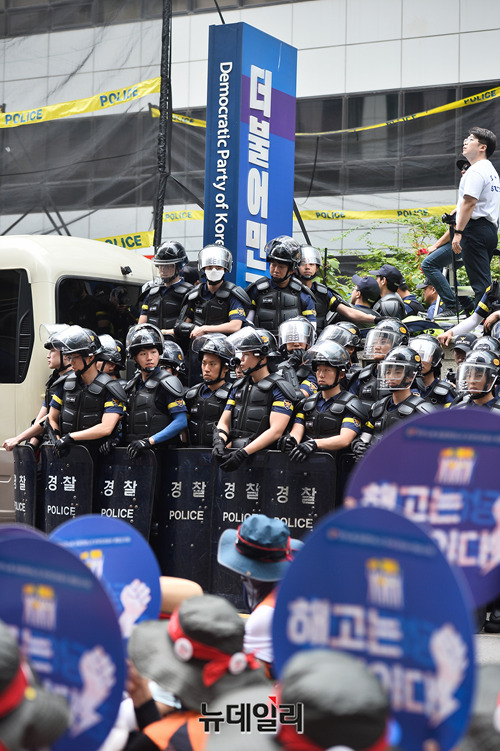 민노총이 15일 오후 서울 여의도 더불어민주당 당사 앞에서 이해찬 대표 면담을 요구하며 경찰과 대치하고 있다. 민노총은 이날 최저임금위원회가 결정한 내년도 최저임금에 반발해 국회 앞에서 결의대회를 열고, 18일부터 총파업에 돌입한다고 밝혔다.