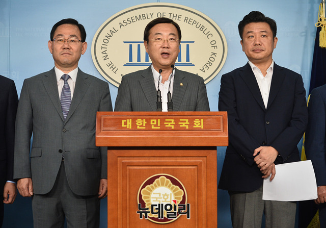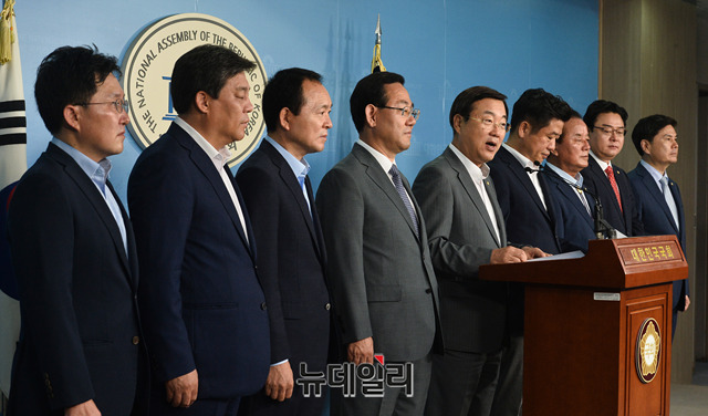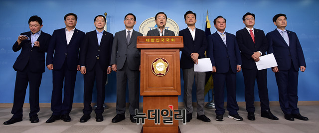 자유한국당 소속 정무위원회 위원(김종석 의원, 김용태 의원, 김선동 의원, 성일종 의원, 주호영 의원, 정갑윤 의원, 김성원 의원), 바른미래당 소속 정무위원회 위원(유의동 의원, 지상욱 의원)들이 15일 오전 국회 정론관에서 기자회견을 갖고 있다.