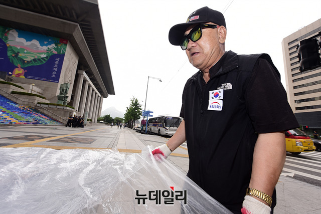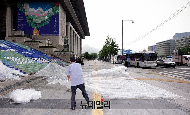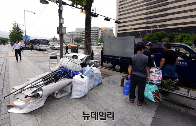 우리공화당이 16일 오전 서울 종로구 광화문광장에 있던 천막 4동을 자진철거하고 있다.이날 우리공화당은 오전 4시 50분께 서울시의 행정대집행을 무력화하기 위해 광화문에 설치된 천막 자진철거를 시작했다. 이후 세종문화회관 앞으로 이동해 집회를 가진 뒤 해산했다.우리공화당 관계자에 따르면 "당 지도부의 결정에 의해 당원들을(박원순 서울시장이 고용한 용역깡패로부터)안전하게 보호하고자 전략적인 자진철거를 결정했다"며 "천막 재설치 시기는 당 지도부의 결정에 따라 조만간 진행될 것"이라고 밝혔다.