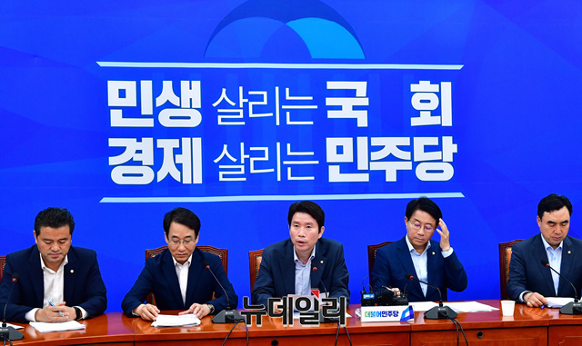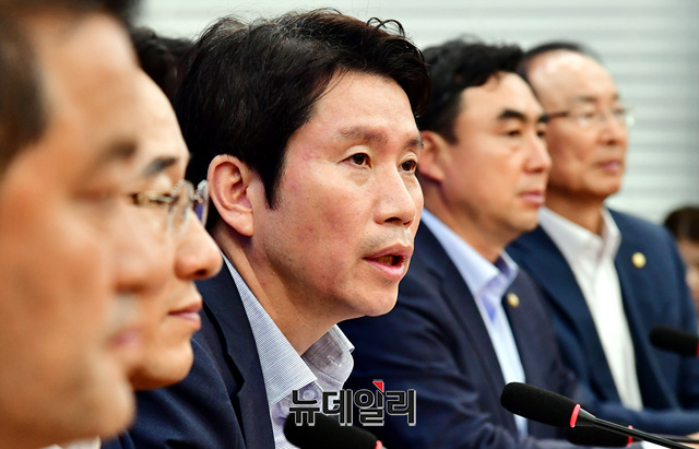 이인영 더불어민주당 원내대표가 16일 오전 국회에서 열린 원내대책회의에서 모두 발언을 하고 있다.