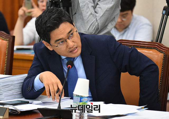 오신환 바른미래당 의원이 16일 오후 국회에서 열린 법제사법위원회 전체회의에 참석해 질의를 하고 있다.
