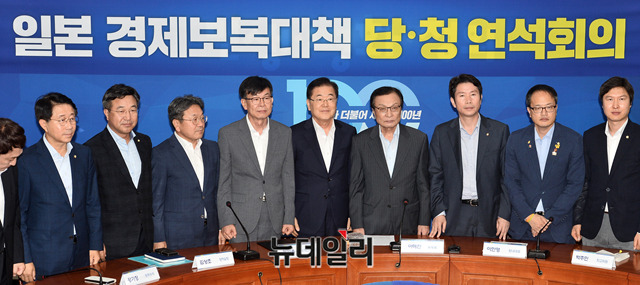 이해찬 대표 더불어민주당 대표, 이인영 원내대표, 김상조 청와대 정책실장, 정의용 국가안보실장, 강기정 정무수석 및 참석자들이 16일 오후 국회에서 열린 '일본 경제보복대책 당청 연석회의'에서 기념촬영을 하고 있다. 이날 회의는 일본의 수출 규제에 대한 대응책을 논의하기 위해 열렸다.