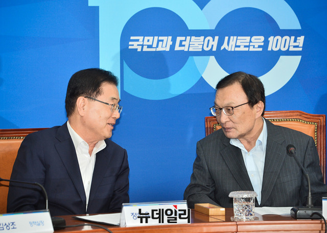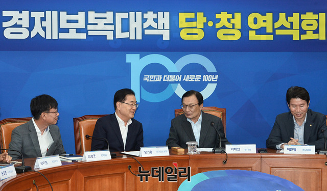 이해찬 더불어민주당 대표와 정의용 국가안보실장이 16일 오후 국회에서 열린 '일본 경제보복대책 당청 연석회의'에서 대화를 하고 있다. 이날 회의는 일본의 수출 규제에 대한 대응책을 논의하기 위해 열렸다.