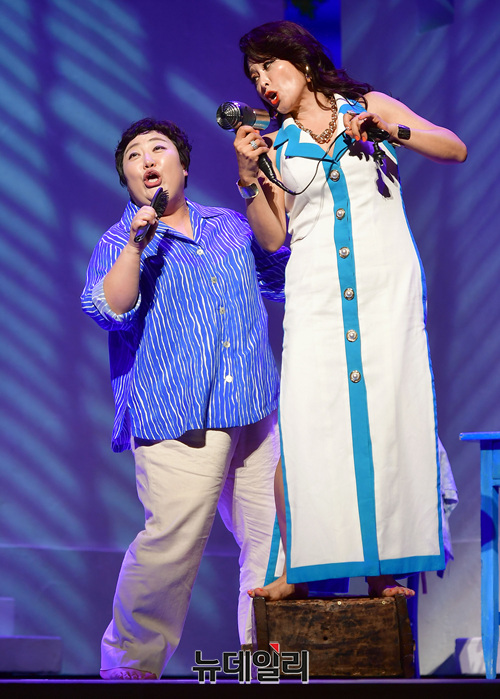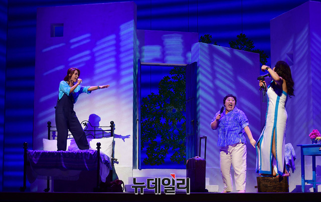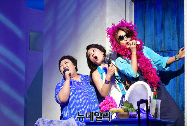 뮤지컬 최정원, 홍지민, 박준면이 16일 오후 서울 강남구 LG아트센터에서 열린 뮤지컬 '맘마미아!' 프레스콜에서 하이라이트 장면을 시연하고 있다.