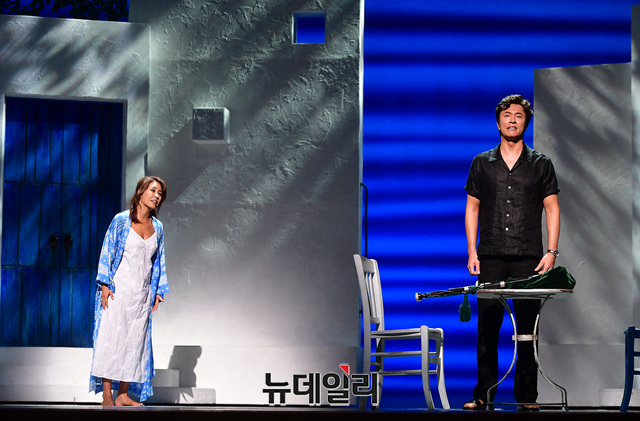 가수 김정민이 16일 오후 서울 강남구 LG아트센터에서 열린 뮤지컬 '맘마미아!' 프레스콜에서 하이라이트 장면을 시연하고 있다.