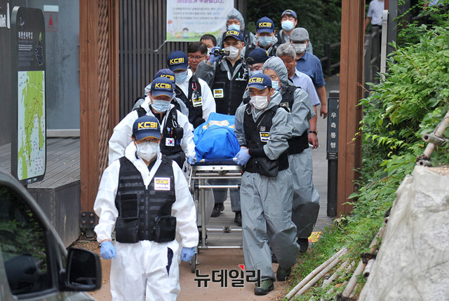 정두언 전 새누리당(자유한국당 전신) 의원이 16일 오후 숨진 채 발견된 서울 서대문구 북한산 자락길 입구에서 경찰이 시신을 운구하고 있다.