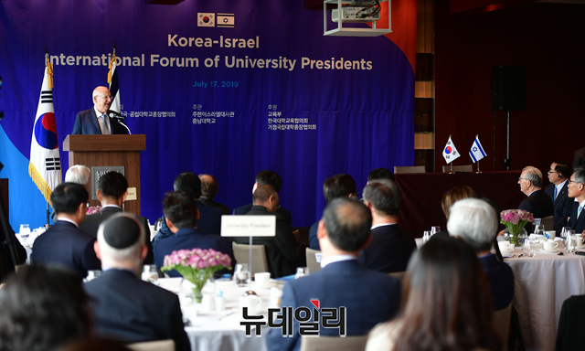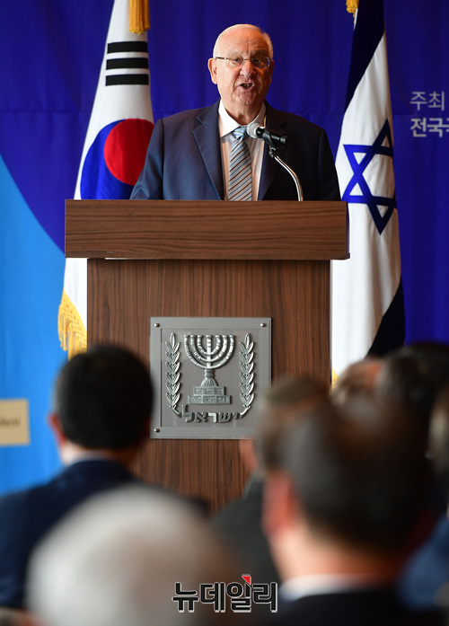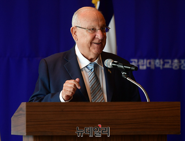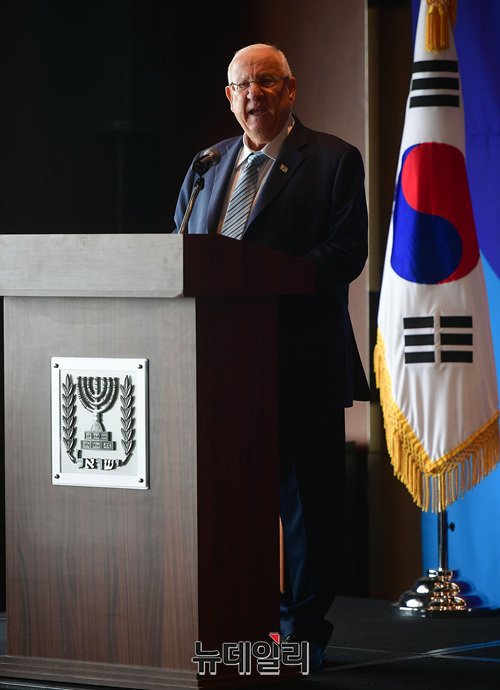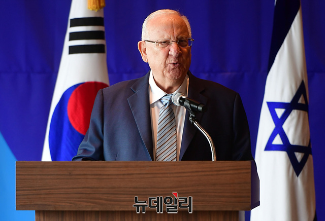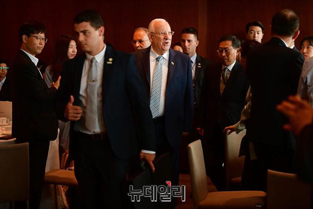 '레우벤 리블린(Reuven Rivlin)' 이스라엘 대통령이 17일 오전 서울 용산구 그랜드 하얏트 서울 호텔에서 열린 '한-이스라엘 총장 국제포럼'에 입장하고 있다.