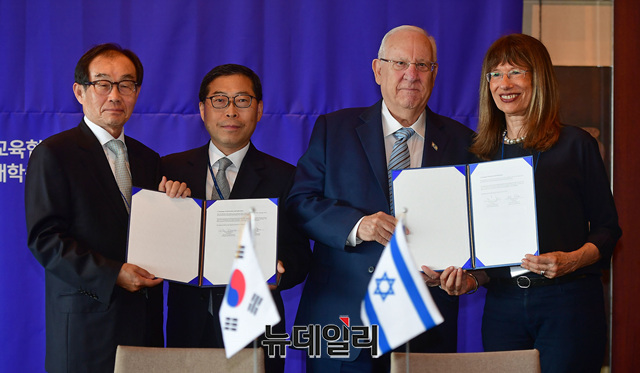 한국과학기술한림원이 17일 오전 서울 용산구 그랜드 하얏트 서울 호텔에서 열린 '한-이스라엘 총장 국제포럼'에서 이스라엘과학인문한림원과 업무협약을 맺고 기념촬영을 하고 있다.