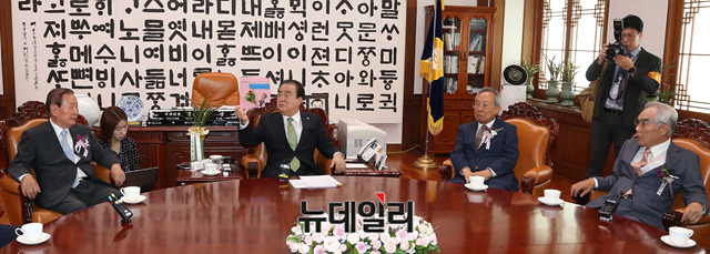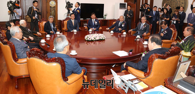 문희상 국회의장이 제71주년 제헌절 경축행사를 맞이한 17일 오전 국회의장 집무실에서 박관용 전 의장, 임채정 전 의장, 정세균 전 의장, 유인태 국회사무총장, 이기우 의장비서실장, 유경헌 헌재회장, 김형오 전 국회장, 강창희 전 의장, 김원기 전 의장과 환담을 나누고 있다.