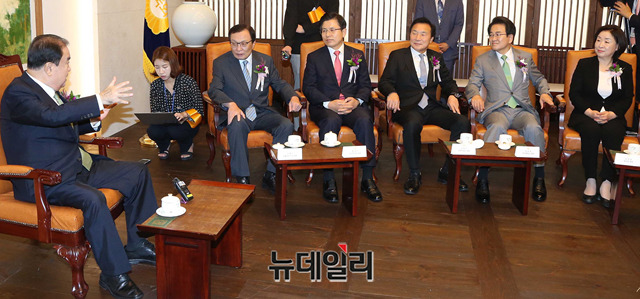 문희상 국회의장이 제71주년 제헌절 경축행사를 맞이한 17일 오전 국회의장 집무실에서 이해찬 더불어민주당 대표, 황교안 자유한국당 대표, 손학규 바른미래당 대표, 정동영 민주평화당 대표, 심상정 정의당 대표와 환담을 나누고 있다.