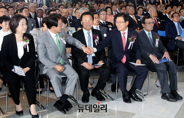 황교안 자유한국당 대표와 정동영 민주평화당 대표가 17일 오전 국회 로텐더홀에서 열린 제71주년 제헌절 경축식에서 대화를 나누고 있다.