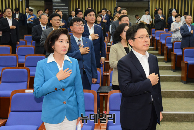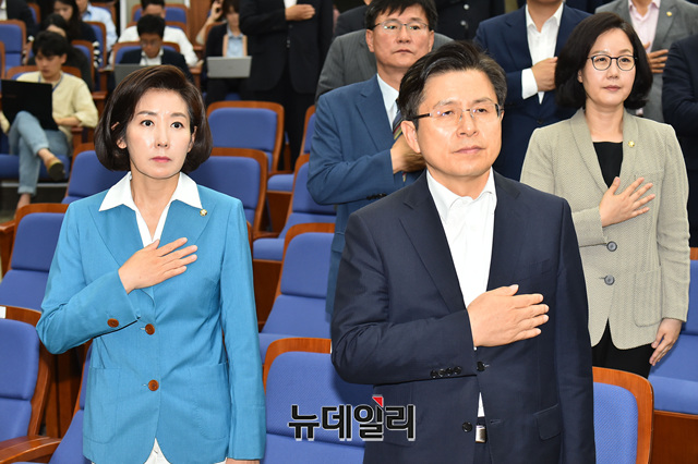 황교안 자유한국당 대표와 나경원 원내대표가 17일 오전 국회에서 열린 정책의원총회에서 국민의례를 하고있다.