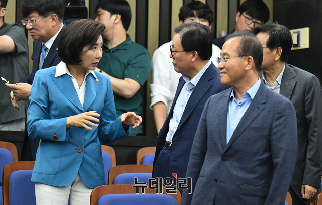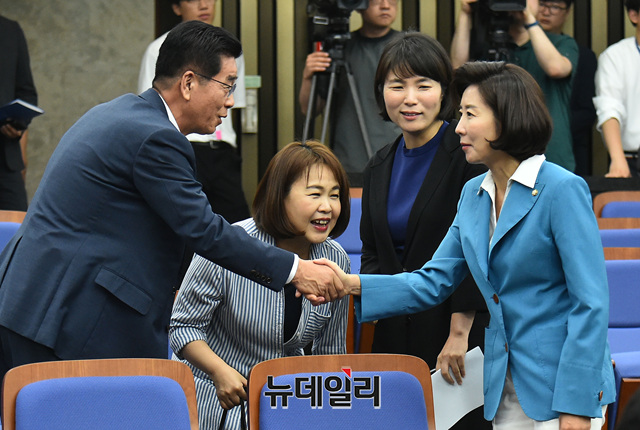 나경원 자유한국당 원내대표가 17일 오전 국회에서 열린 정책의원총회에서 참석하며 동료의원들과 악수를 나누고 있다.