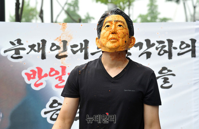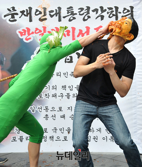 전국대학생대표자협의회(이하 전대협)가 17일 오후 서울 종로구 주한 일본대사관 앞에서 '구국의 국뽕반일선동' 기자회견을 열고, 아베 일본총리의 뺨을 김치로 때리는 퍼포먼스를 하고 있다.전대협 관계자는 "일본의 수출규제의 책임은 반일감정을 조장하고, 반일교육, 반일문화를 조성한 문재인 정권과 그 지지세력에게 있다"며 "풍자를 통해 이를 비판하고자 이번 기자회견을 개최했다"고 기자회견의 퍼포먼스 취지를 밝혔다.전대협은 2017년 문재인 정부 출범 이후 만들어진 단체다. 1987년 결성된 친북 성향의 학생운동단체 전대협과 정치적 지향이 정반대다. 대부분이 우파 성향의 대학생으로 구성됐으며, 현 정부의 비판과 풍자하는 활동을 하고 있다.