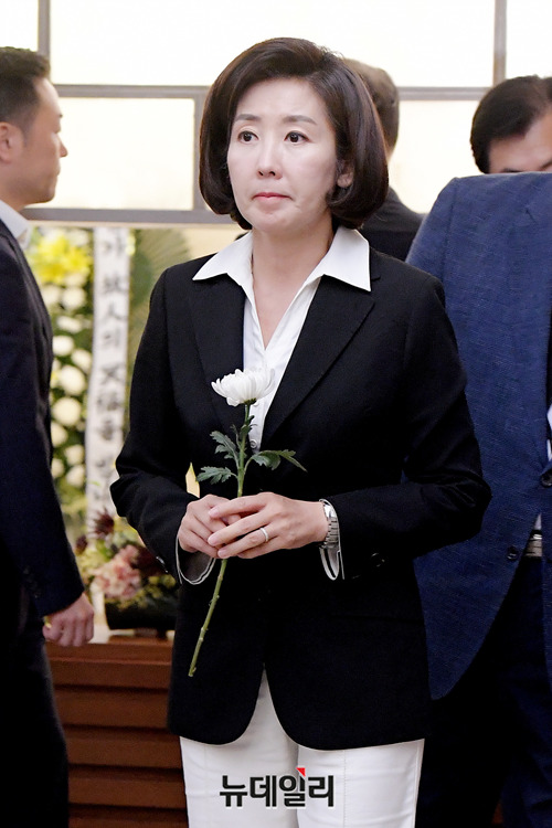 나경원 자유한국당 원내대표가 17일 오후 서울 서대문구 신촌세브란스병원에 차려진 故 정두언 전 의원의 빈소를 찾아 조문하고 있다.